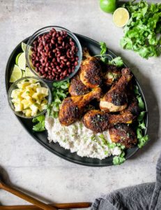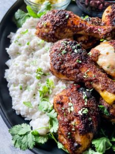 Caribbean jerk chicken is great on its own or shredded over a salad or with some steamed veggies, but if you want to pair with some more authentic side dishes then I would highly suggest my creamy coconut rice, black beans and pineapple salsa. All of these flavors together create a fabulous plate that is sweet, tangy, tart, spicy and delicious.
