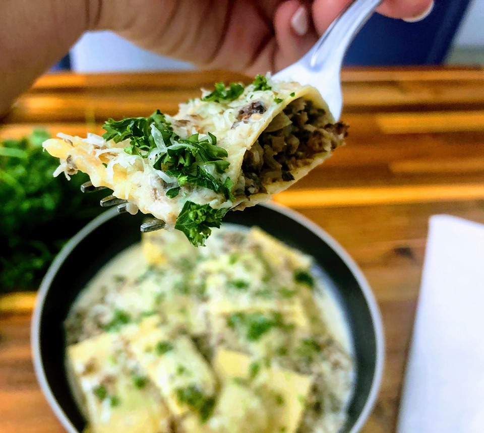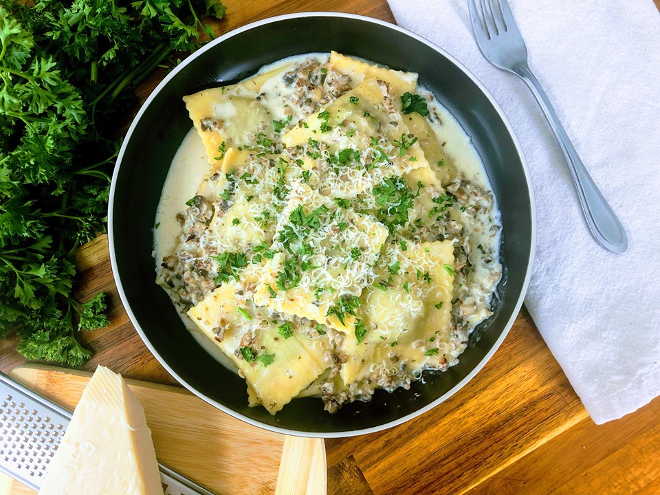 Fresh Ravioli with Italian Sausage, Mushrooms and Shallots