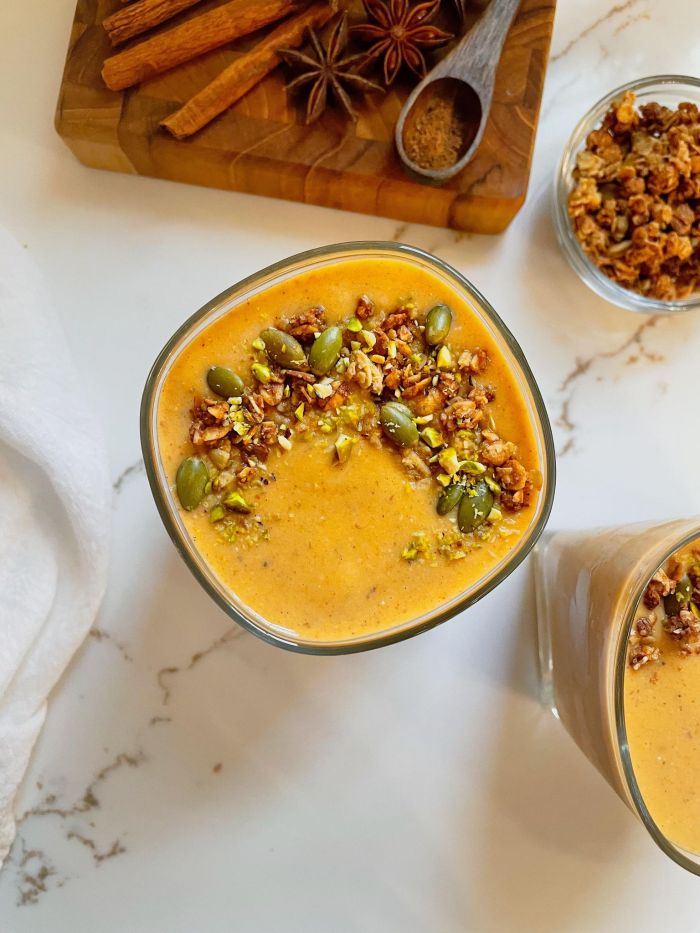 A healthy, low sugar smoothie with roasted butternut squash and chai inspired spices.