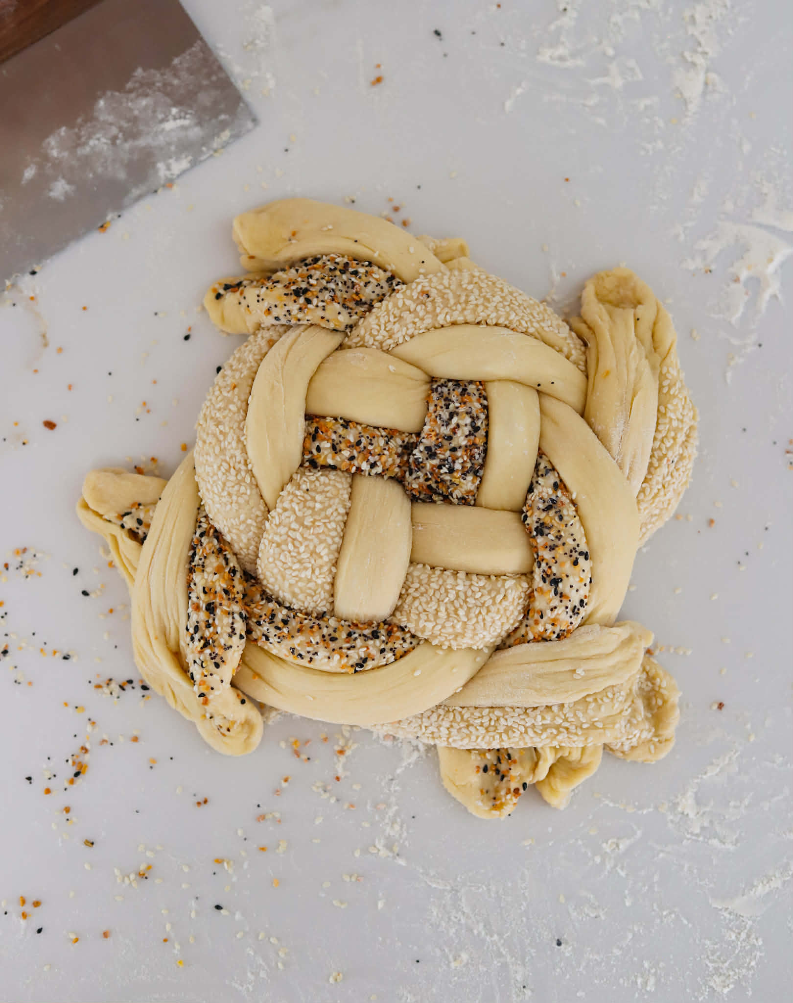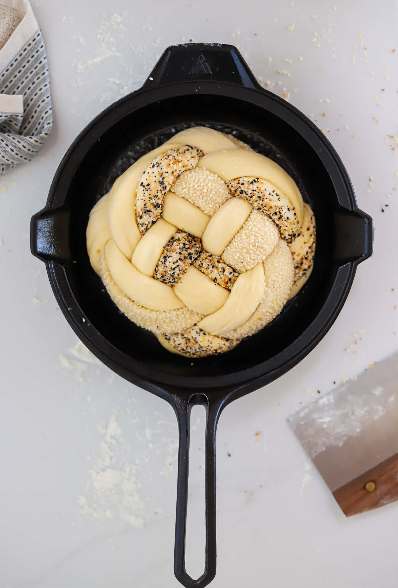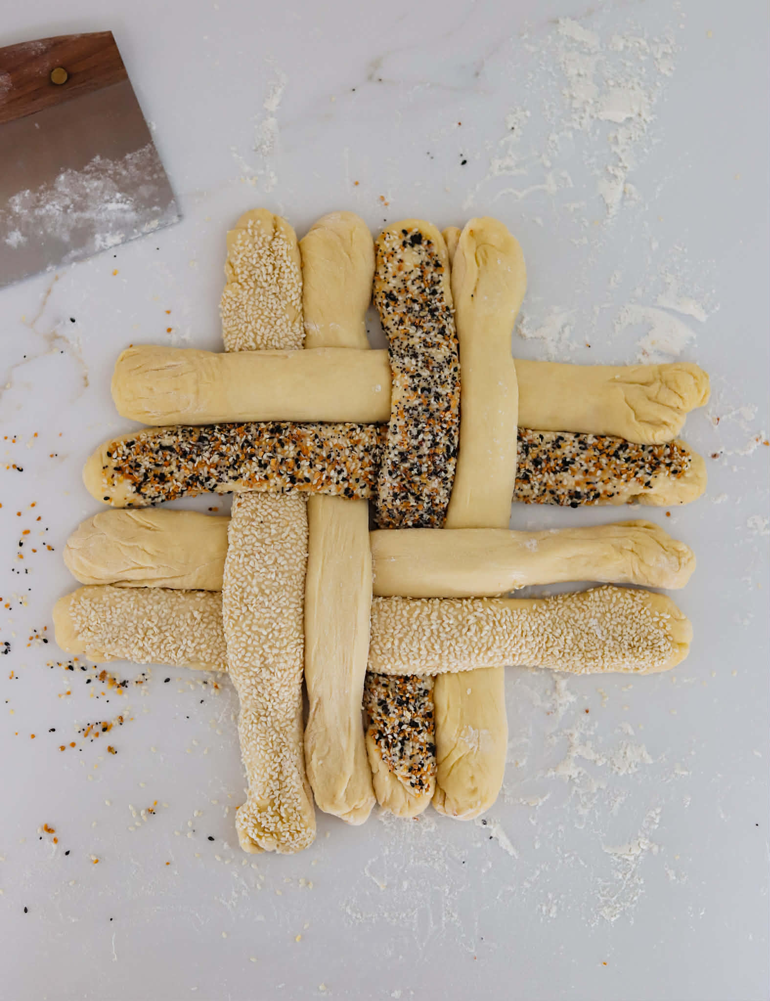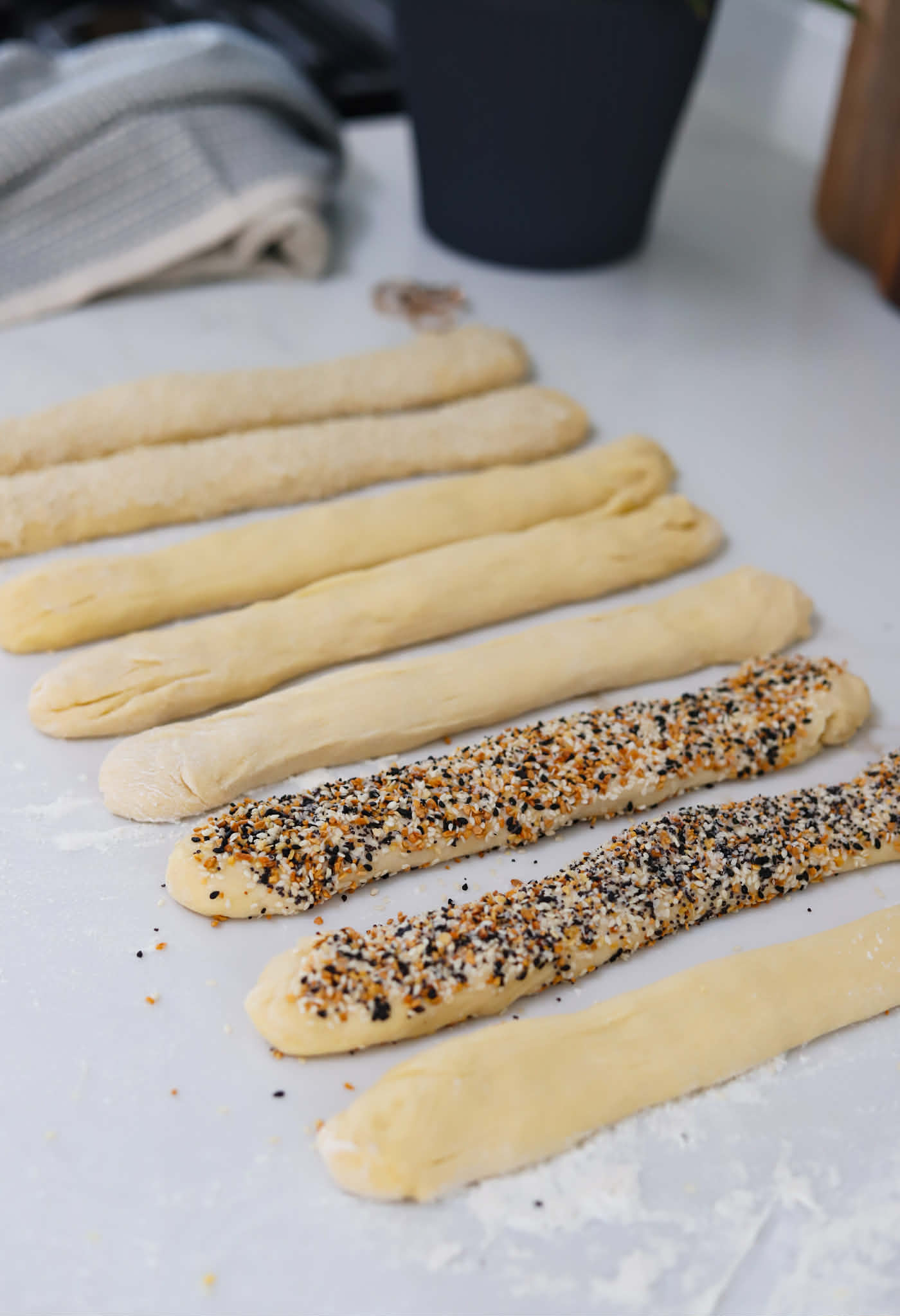 - If coating strands in sesame seeds or everything bagel seasoning is desired, roll 4 of the strands over a damp paper towel and then coat in sesame seeds