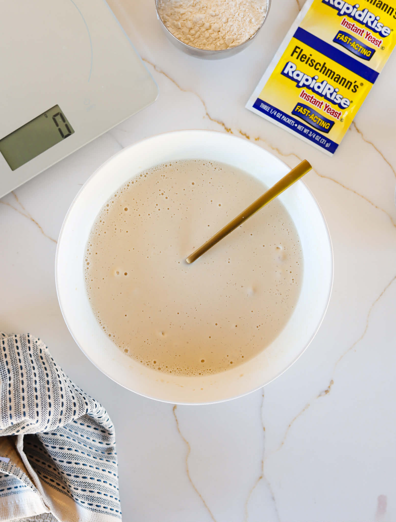 - Whisk 100 grams of bread flour and an envelope of instant yeast into 235 grams of warm water and set aside for about 45 minutes
