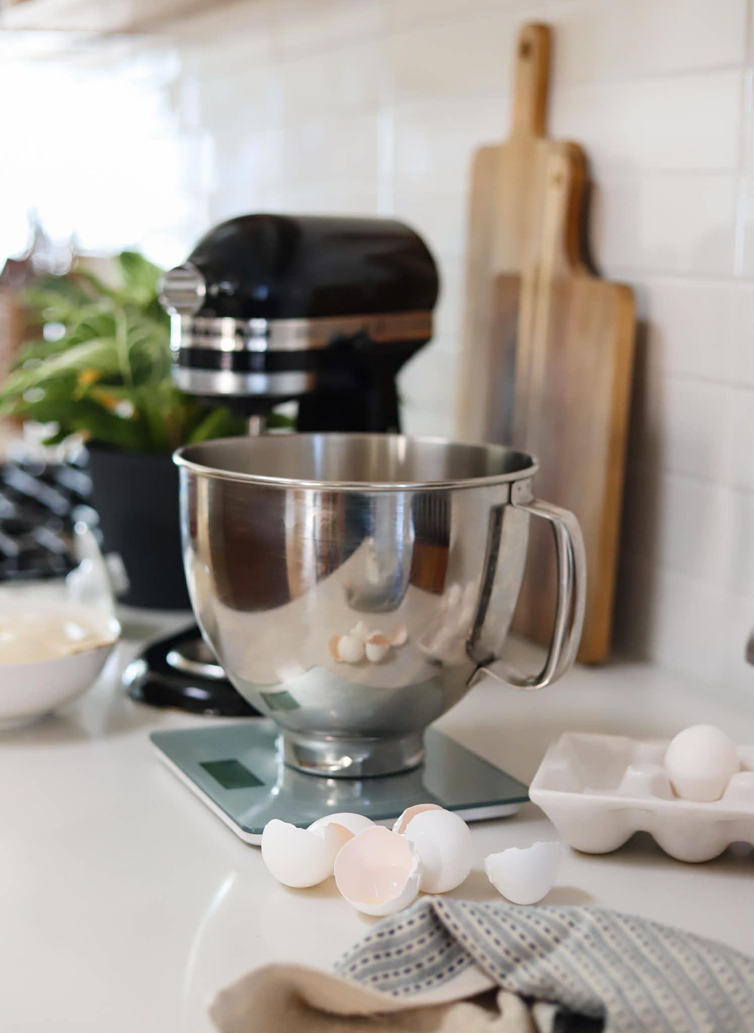 - In a large bowl (if working by hand) or the bowl of your stand mixer, combine 435 grams of bread flour, 12 grams of salt, 50 grams of a neutral oil, 65 grams of granulated sugar and 3 large eggs