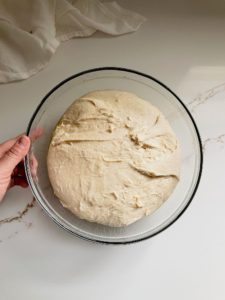 Once your dough feels soft and elastic, form it into a round ball and transfer it into a lightly greased bowl. Flip the dough around a few times to make sure that the entire surface of the dough is lightly oiled and then cover the bowl tightly with plastic wrap and let the dough rest in a warm place for 60-90 minutes.