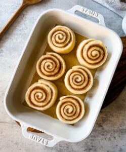 - Transfer the rolls into a greased and parchment lined 7”x11” baking dish