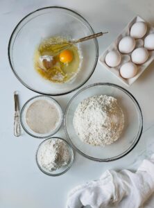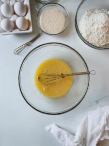 While the yeast is blooming, whisk 1 large egg with 3 tablespoons of melted butter, 1 teaspoon of vanilla extract, 1/2 teaspoon of salt and 1/4 cup of granulated sugar in a large bowl and add about 1 cup of the bread flour.