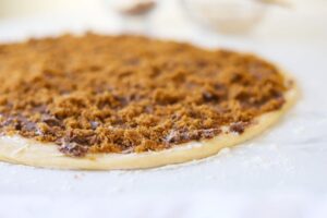 Once the chestnut cream has been evenly spread over the buttered surface of the dough, sprinkle about 1/3 cup of brown sugar and a teaspoon of ground cinnamon over the chestnut cream. A third of a cup of brown sugar will give you gently sweet rolls, but if you prefer your rolls sweeter then I would suggest using 1/2 cup of brown sugar instead.