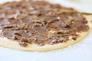 Once the dough is rolled out, spread 3 tablespoons of softened butter over the entire surface and then top with a cup of sweet chestnut cream.