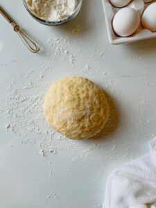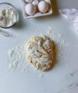 You want to knead this dough for a few minutes or until it is smooth and elastic. The less flour you work into this dough, the softer it will be in the end, so I prefer to add flour to my hands if things are too sticky instead of adding it directly into the dough.