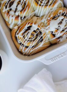 - Drizzle the vanilla glaze over the cinnamon rolls and serve warm