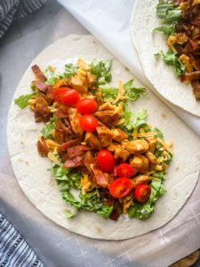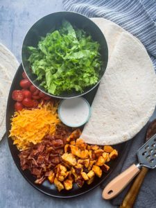 Gather your browned flavor filled chicken, the crispy bacon, shreds of sharp cheddar, a few tortillas, chopped leafy greens and some buttermilk ranch and let’s start this assembly line..
