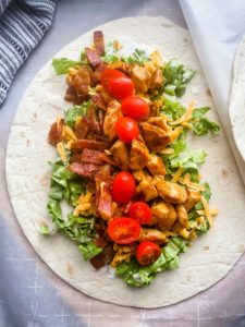 - Assembled wraps by adding ranch dressing, chicken, bacon, cheese, tomatoes and lettuce and wrapping as you would a burrito