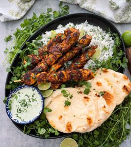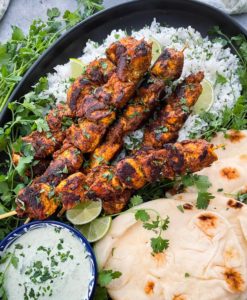 I love pairing these chicken tikka masala skewers with some creamy cilantro lime dipping sauce, a big pile of cilantro lime rice and some warm naan or pita bread. I just love tearing off a piece of naan, wrapping it around a piece of that gorgeous chicken and then I dip the whole thing into the cilantro lime dip and I am instantly in love.