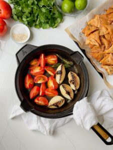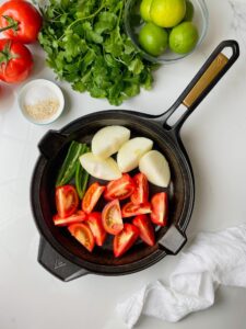 - Place the quartered tomatoes, onion and the jalapeño into a cast iron skillet and broil until the edges are lightly charred