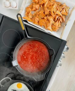 So there are 3 elements to this Latin breakfast comfort food staple: the chips, the sauce and the toppings…