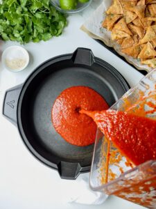 Pour the rojo sauce back into the skillet you charred your vegetables in and place it over medium heat.