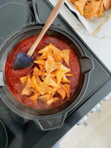 Once the rojo sauce smells fantastic and has developed a deep red color, transfer the skillet off of the heat and toss in your tortilla chips. Mix until they are all generously coated in sauce and garnish with some crumbled cojita or queso fresco and fresh cilantro.