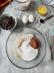 - Combine 1 1/2 cups of all purpose flour, 1/4 cup of unsweetened cocoa powder, 1/3 cup of granulated sugar, 1/2 teaspoon of salt, 3/4 teaspoon of baking soda and 1 1/2 teaspoons of baking powder in a large bowl