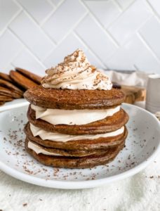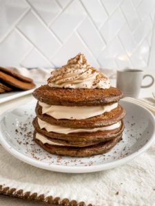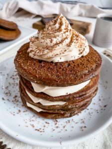 Once all of the pancakes are ready to go, build yourself a nice stack, add a little bit of peanut butter whipped cream and get ready to enjoy the best chocolate pancakes ever…