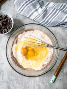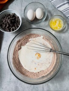 Use your whisk to form a little well in the center of the bowl and pour 1 1/3 cups of buttermilk (I prefer to use full fat buttermilk, but low fat will work as well) into the well, along with 3 tablespoons of melted butter, 2 eggs and 1 teaspoon of vanilla extract.