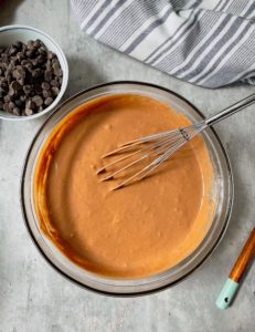 Whisk the ingredients until they are just combined. As long as the wet and dry ingredients have incorporated and you no longer see dry flour in the batter, you are good to stop whisking. Pancake batter will have some lumps and those lumps will eventually result in light, fluffy pancakes. If you mix the batter until it is smooth, your pancakes will be flat and chewy. Light, fluffy pancakes are so much better, so leave those lumps…