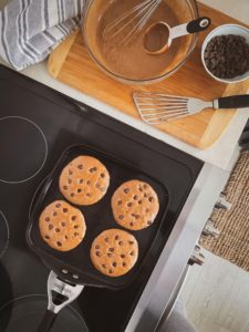 - Drop batter onto the warm greased skillet and sprinkle each pancake with chocolate chips