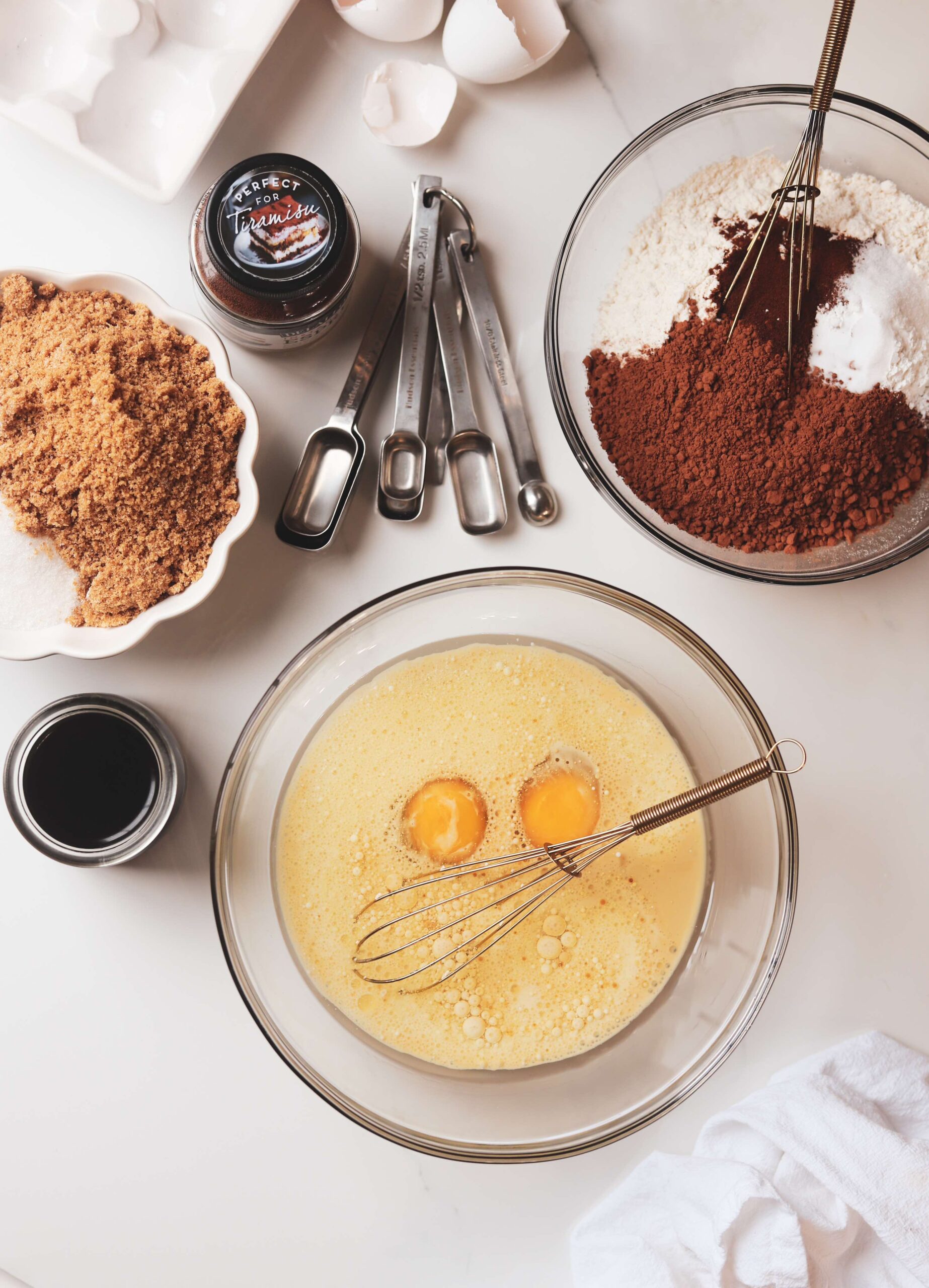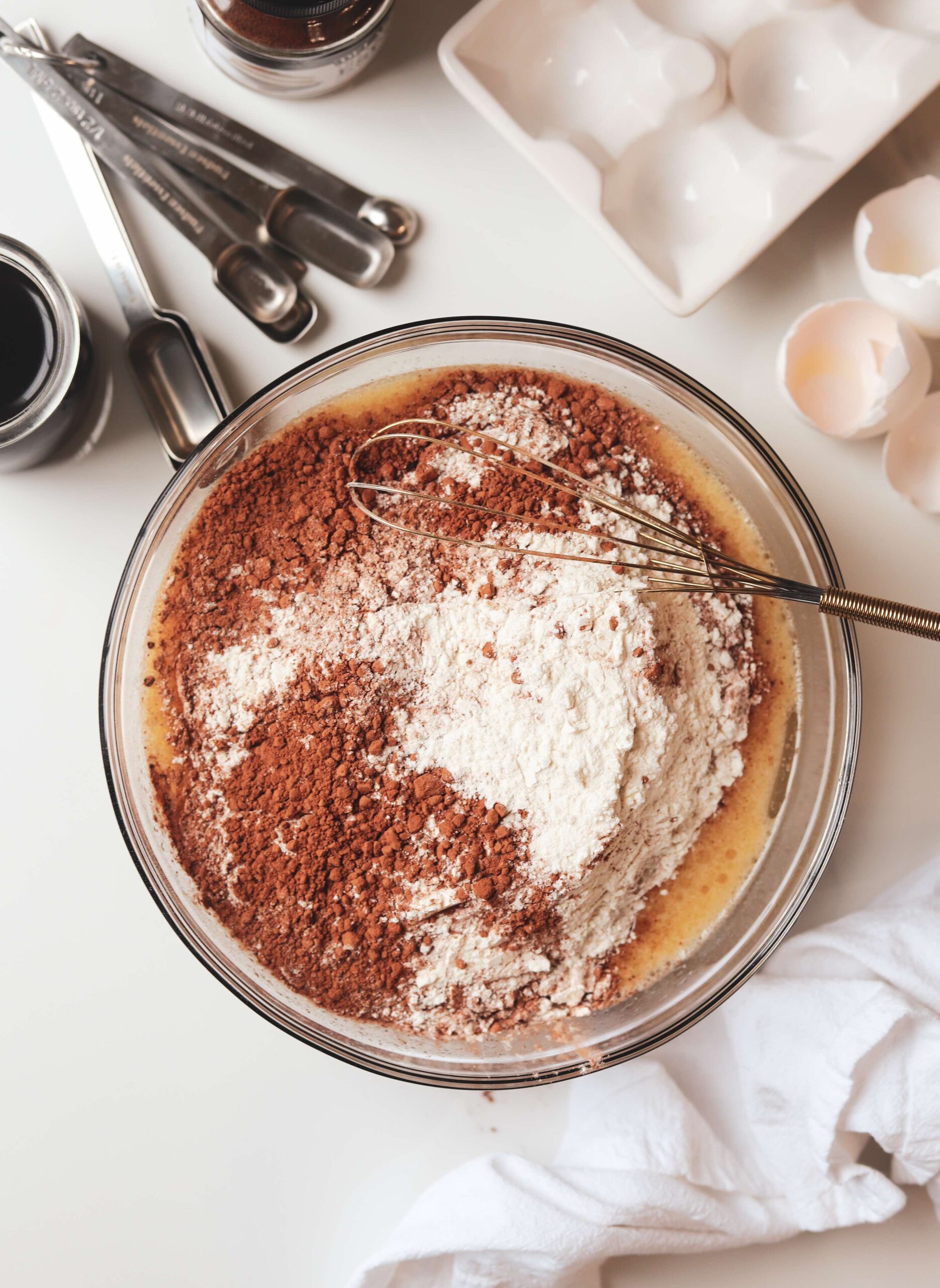 - Sift 2 cups of all purpose flour, 3/4 cup of natural unsweetened cocoa powder, 1 tablespoon of espresso powder, 2 teaspoons of baking powder, 1 teaspoon of baking soda and 3/4 teaspoon of salt into the bowl and mix until just combined