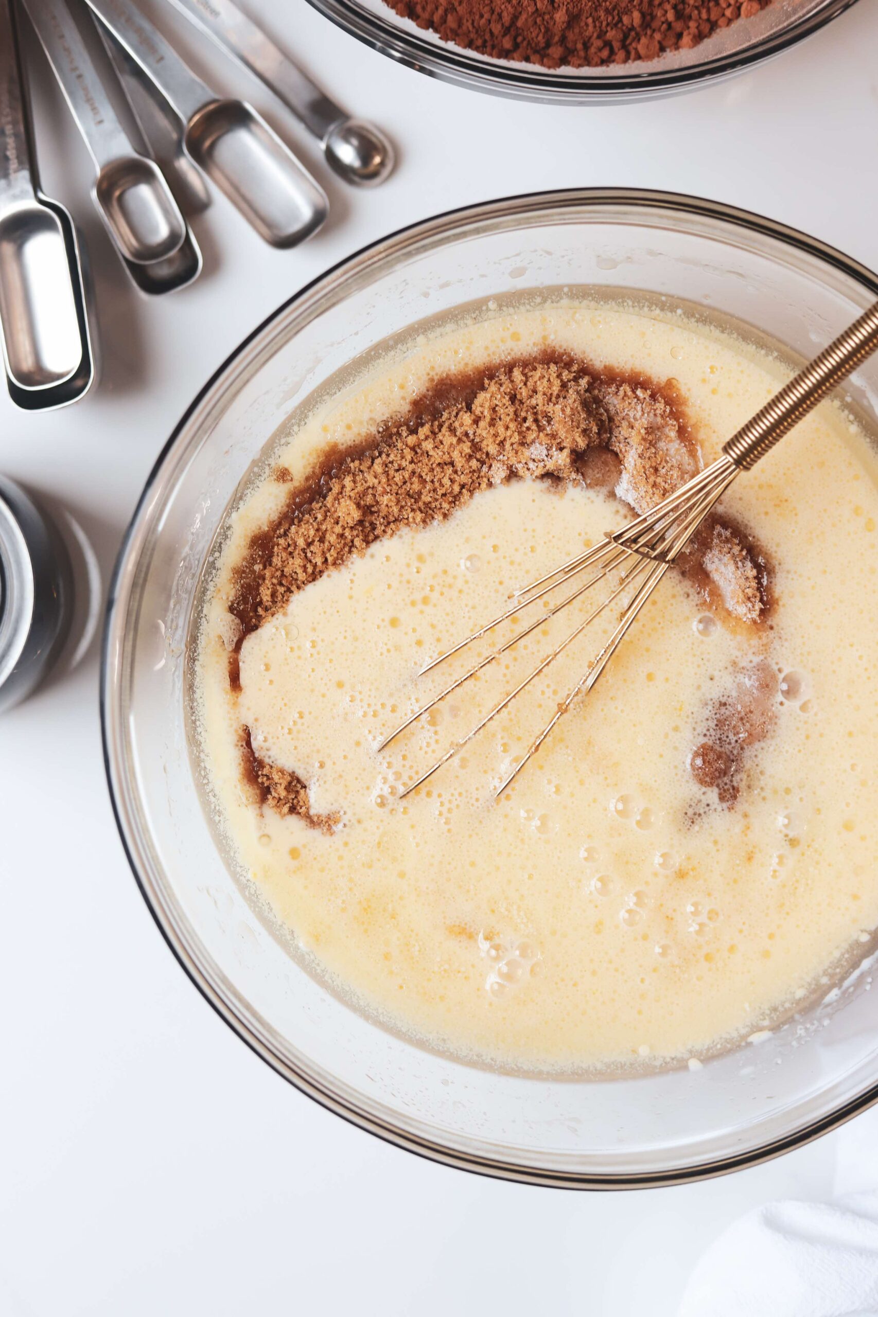 Add a cup of granulated sugar and a cup of brown sugar and whisk until the sugars have been completely incorporated.