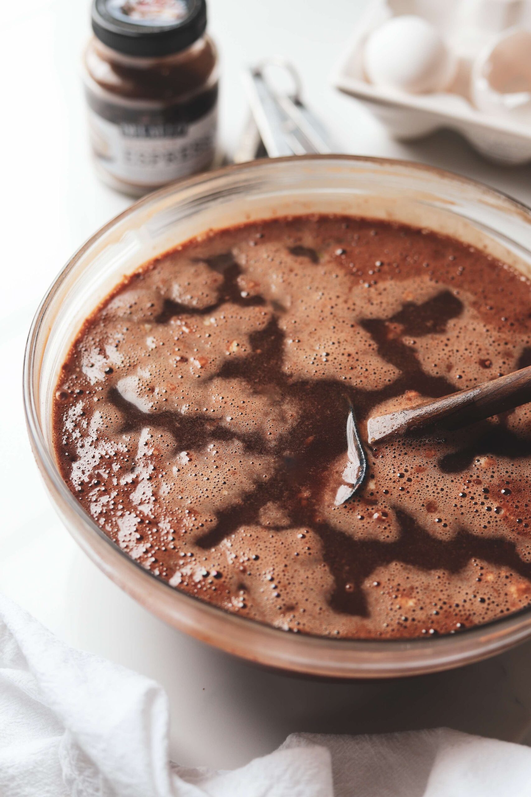 - Add a cup of freshly brewed coffee or boiling water into the batter and mix until incorporated
