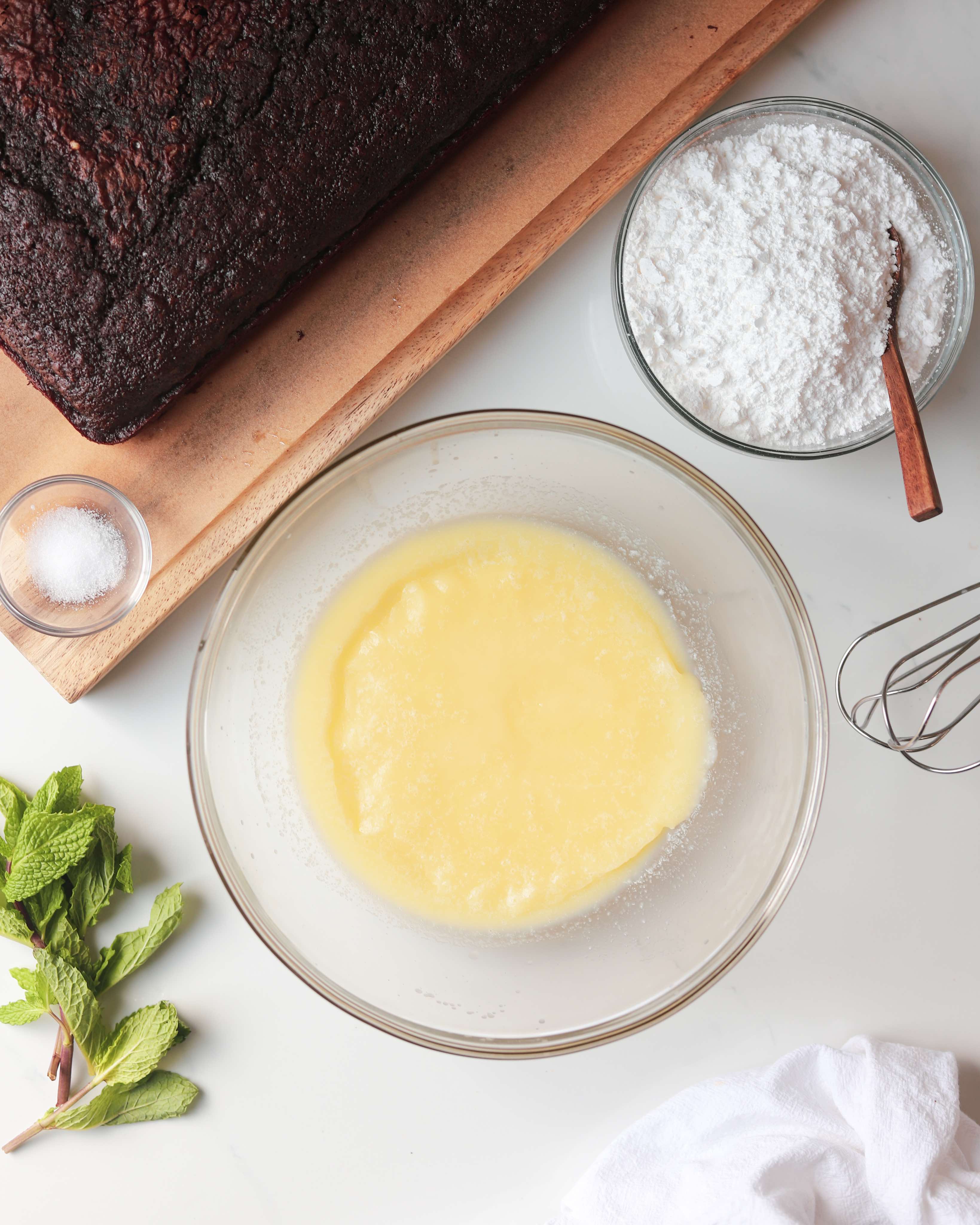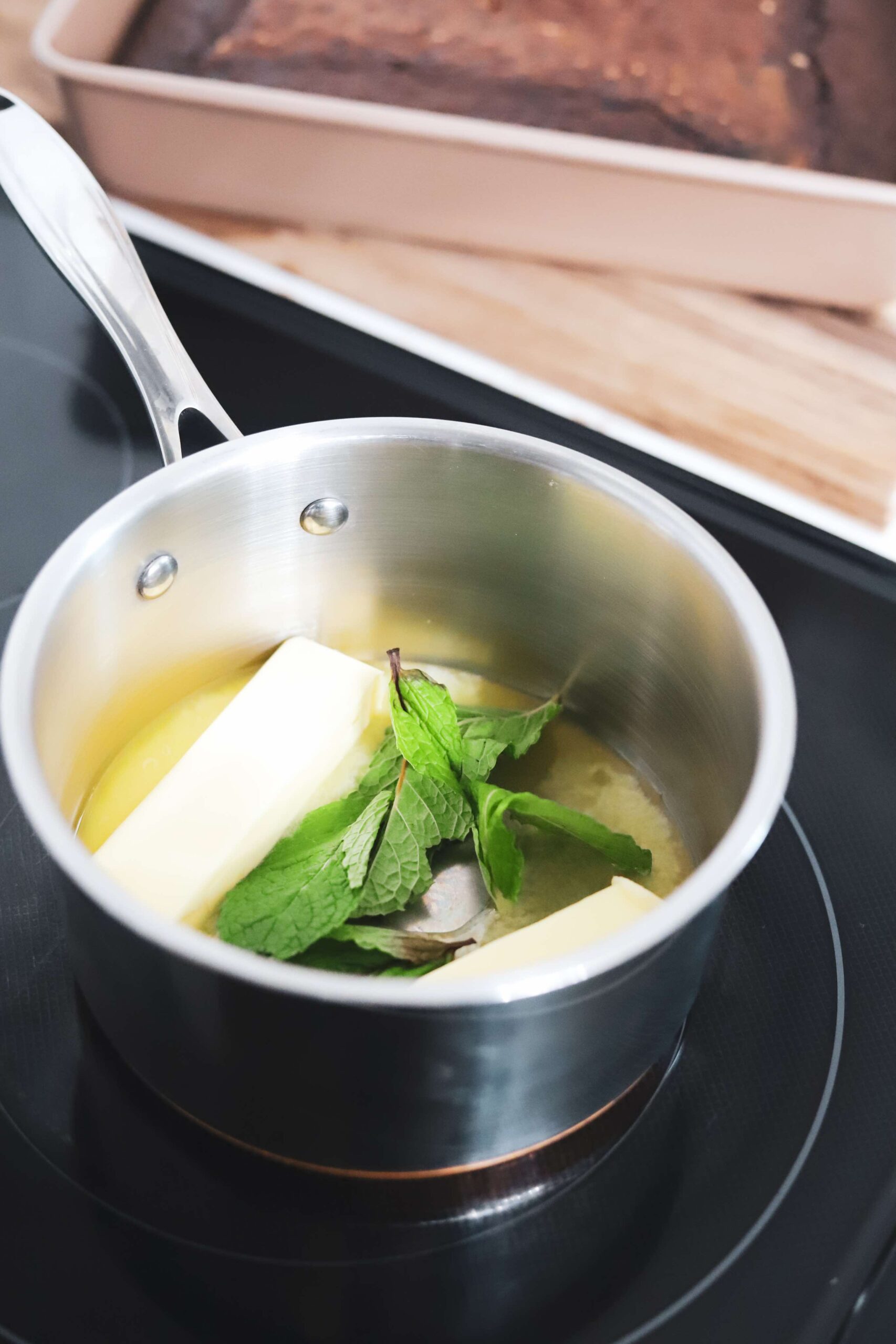 - Discard the mint leaves, transfer the melted butter into a large bowl and set aside to cool to room temperature