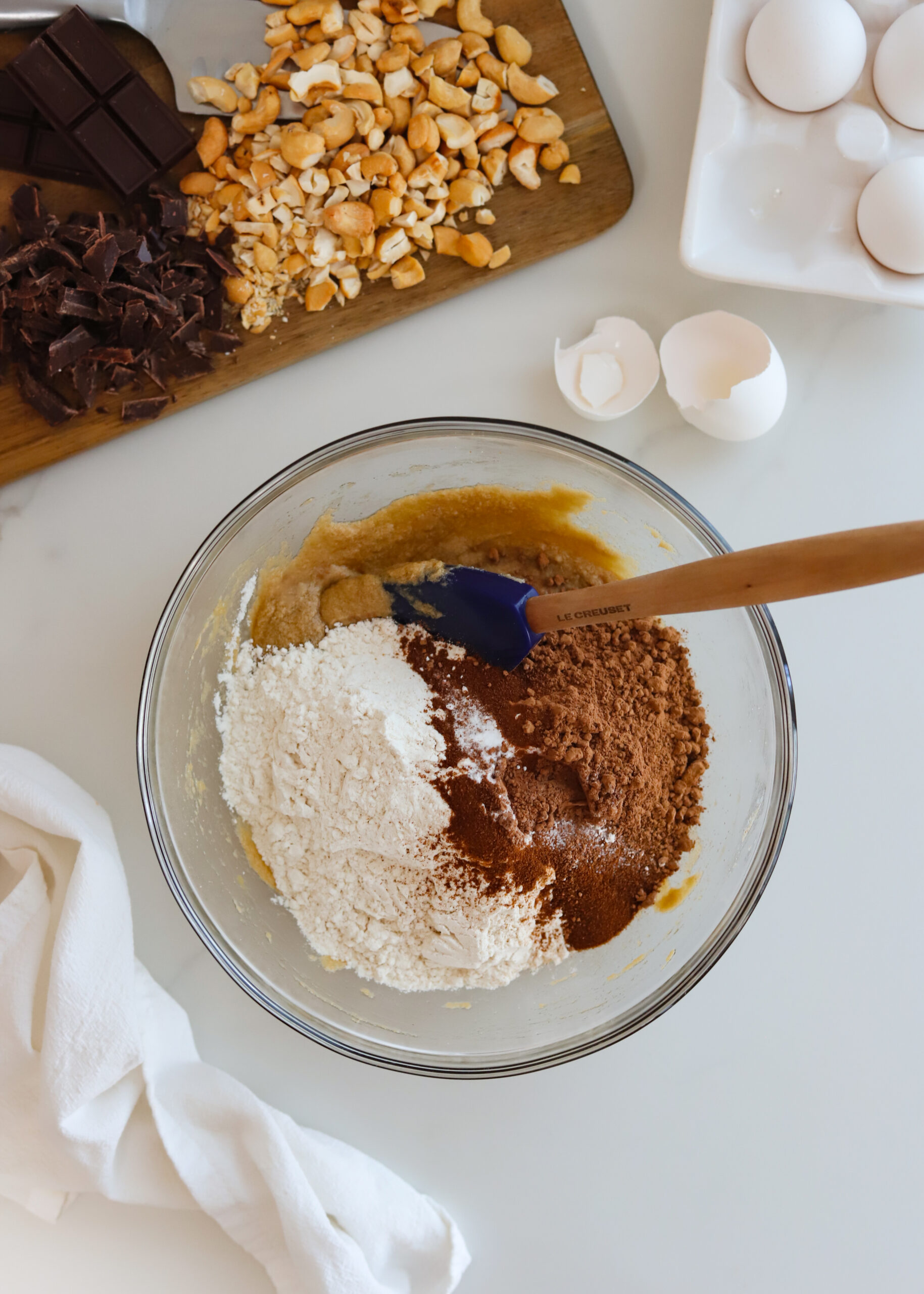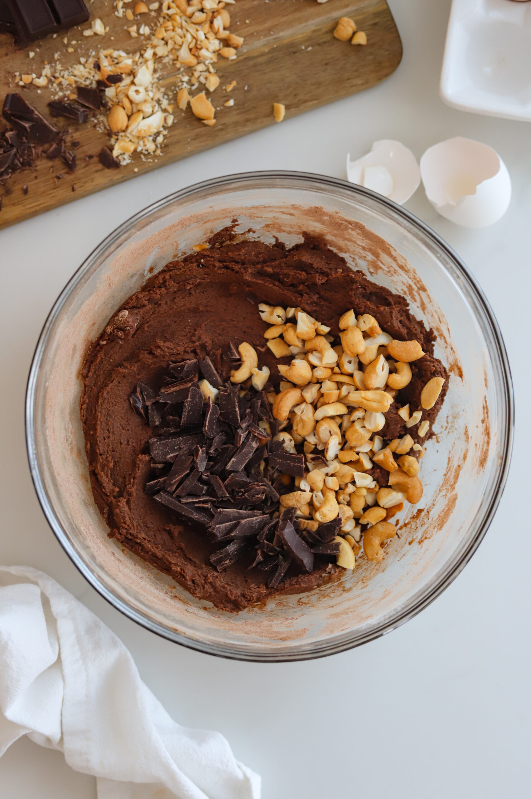 Fold in 3/4 cup of chocolate chips or chunks and 3/4 cup of roughly chopped cashews until everything is evenly distributed.