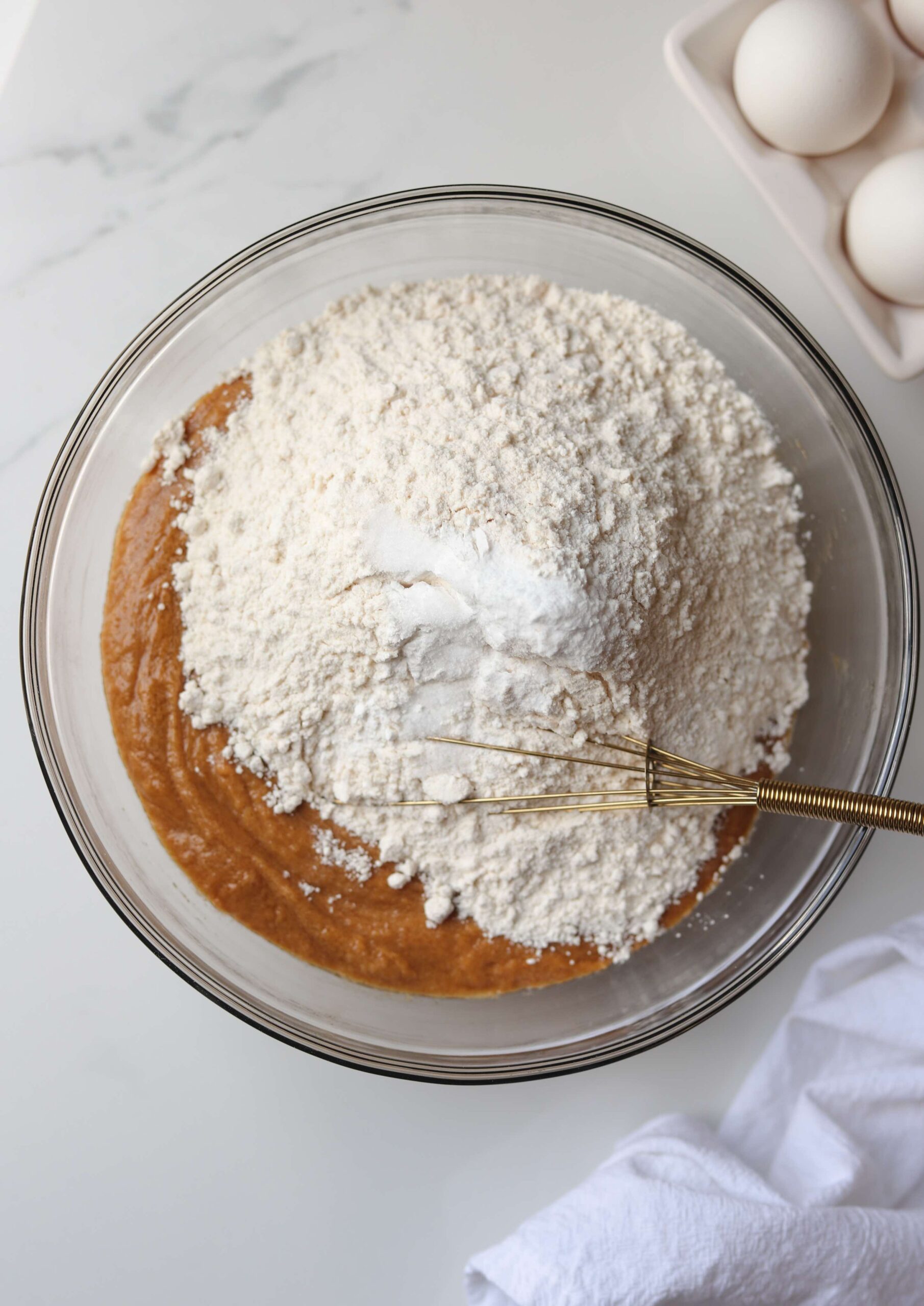 - Add 2 cups of all purpose flour, 3/4 teaspoon of baking soda, 1 teaspoon of baking powder and 1/4 teaspoon of salt and mix until just combined
