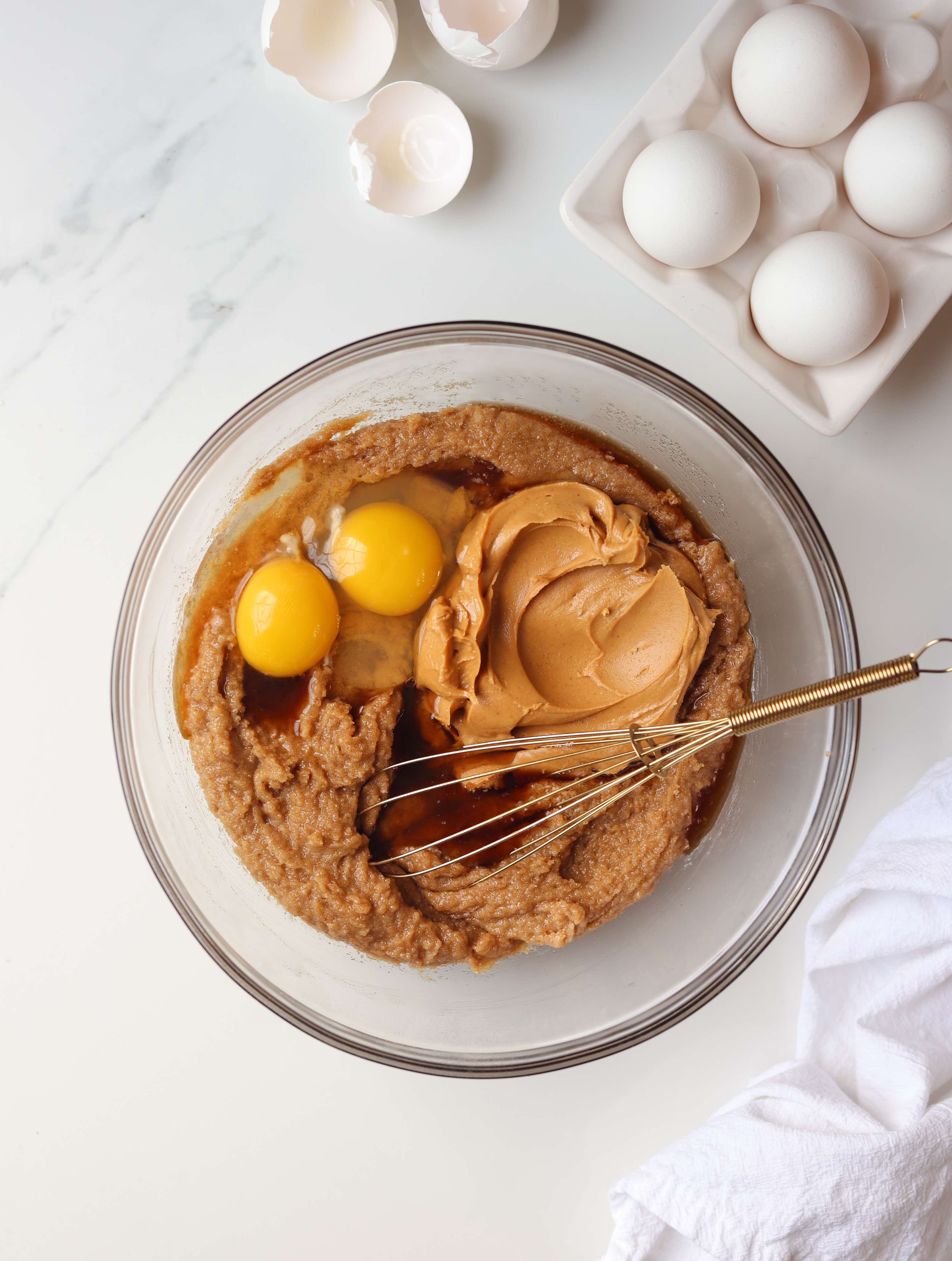 Now add 2/3 cup of creamy peanut butter, a large egg and a large egg yolk and 2 teaspoons of pure vanilla extract and mix until the peanut butter is evenly distributed throughout the mixture.