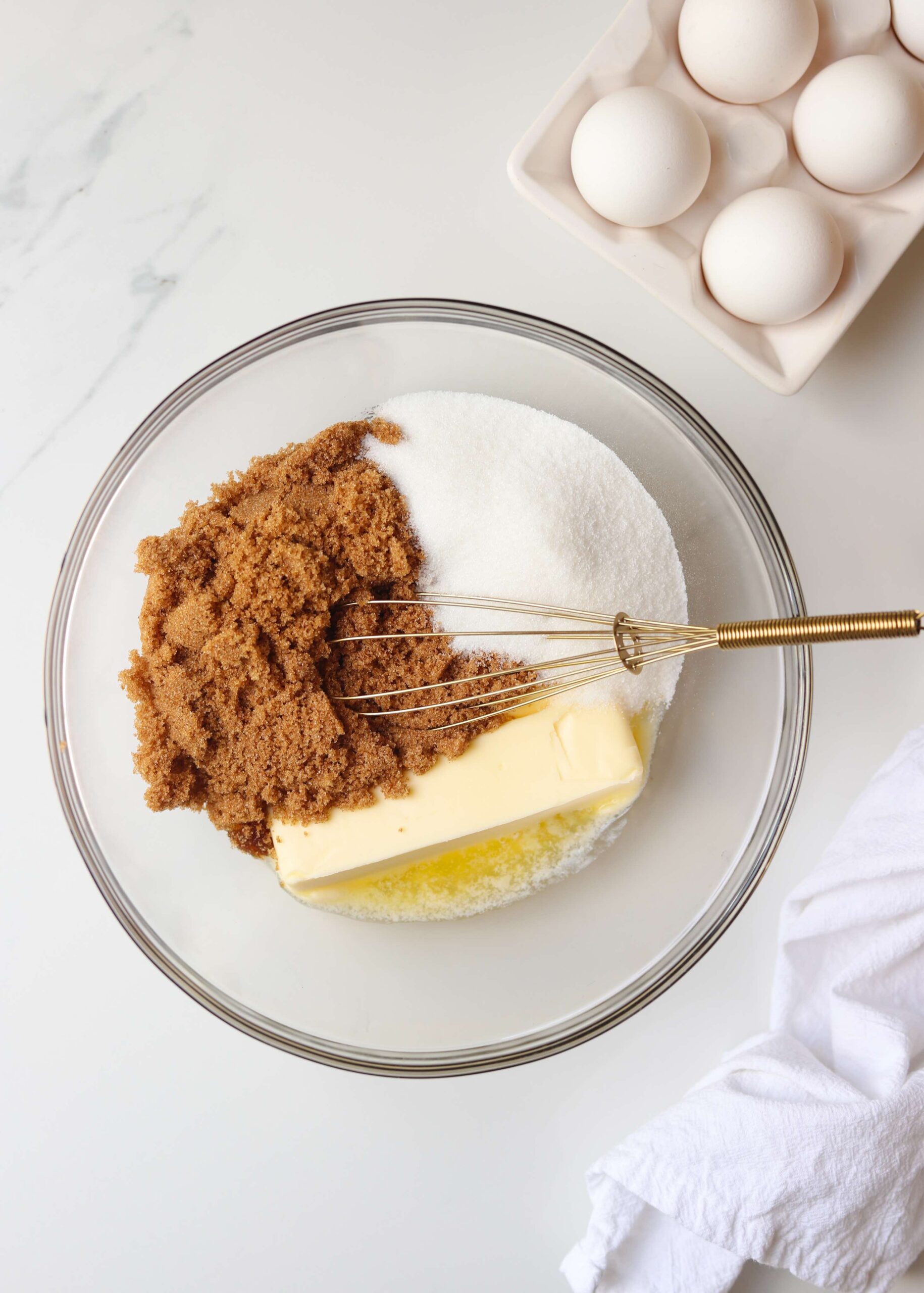 Begin by creaming 3/4 cup of room temperature butter with 1 cup of brown sugar and 1/2 cup of. granulated sugar. You can do this using an electric hand mixer or a stiff whisk.