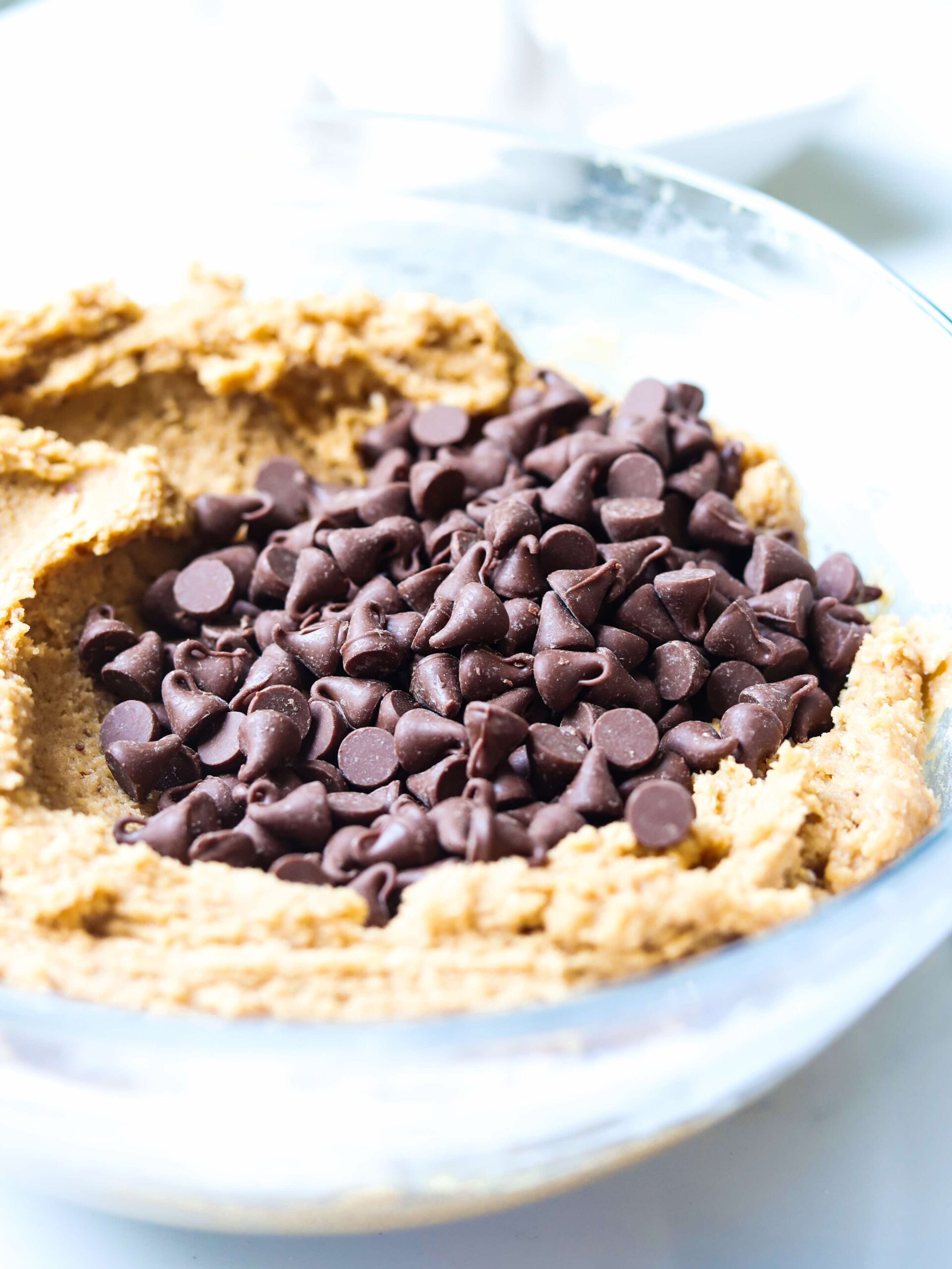 - Fold 1 1/2 cups of chocolate chips or chopped chocolate into the cookie dough until evenly distributed