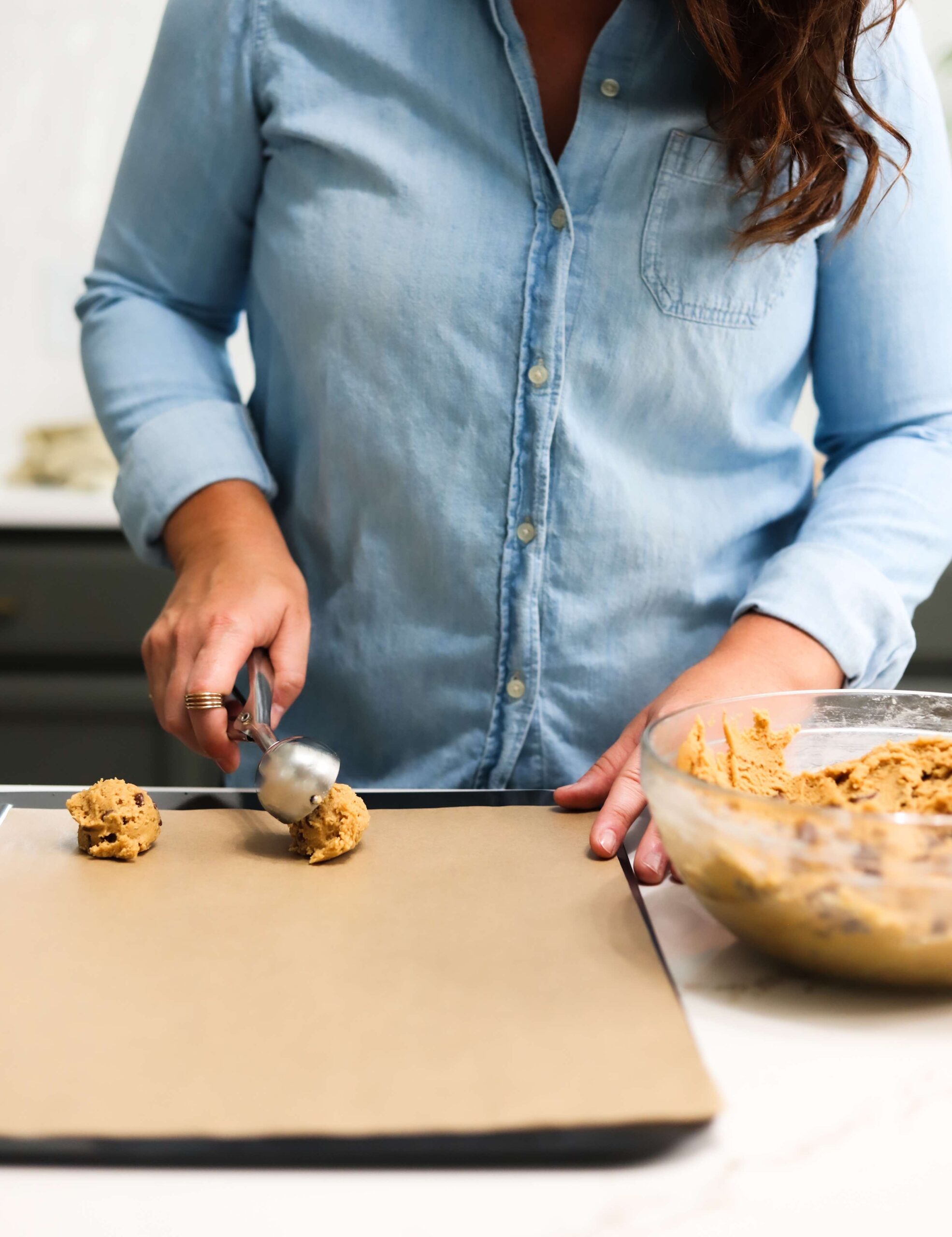 Drop equal portions of cookie dough 2 inches apart on a non-stick or parchment lined baking sheet. You can eye ball the cookie dough or spray a scooper with non-stick spray and use that to portion out your cookie dough.