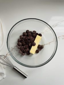Begin by melting 1/2 cup of butter in a large mixing bowl and 6 ounces of dark chocolate in a large bowl. You can do this over a double boiler or in 15 second increments in your microwave. The microwave is the quickest way to do it, but be sure to keep an eye on your chocolate. Remove the bowl and give the chocolate a gently whisk as soon as the butter begins to melt. If the chocolate is not quite soft enough, give it another 15 second spin in the microwave and try again until the chocolate and butter are fully melted , smooth and glossy.