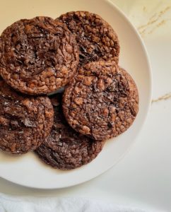 Allow the cookies to cool on the baking sheet until they firm up a bit and then carefully transfer them onto a cooling rack. If you want to dress them up, sprinkle some finely chopped chocolate and a little sea salt over the tops of each cookie as soon as you pull them out of the oven. This will give the tops of each cookie a beautiful look and will also as a beautifully salty layer to the flavor of these rich chocolate cookies.