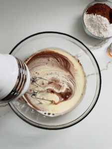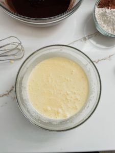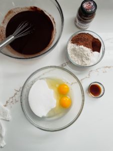 Add the melted chocolate and butter into the creamed sugar and eggs and whisk until fully combined.