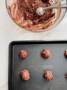 This cookie dough is thick, so carefully fold the chocolate chips in and then grease a cookie dough scoop for transferring heaping tablespoon portions onto your non-stick or parchment lined baking sheets.