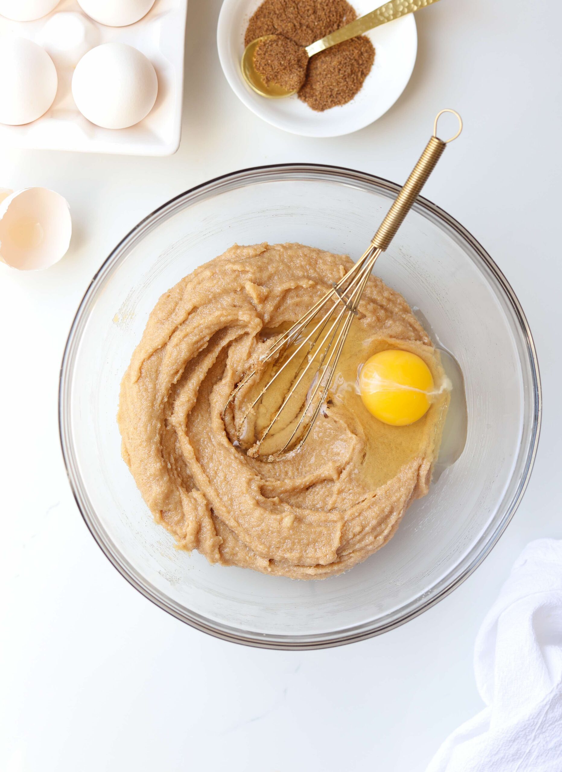 - Add a large egg and a teaspoon of vanilla extract and whisk vigorously until fully combined