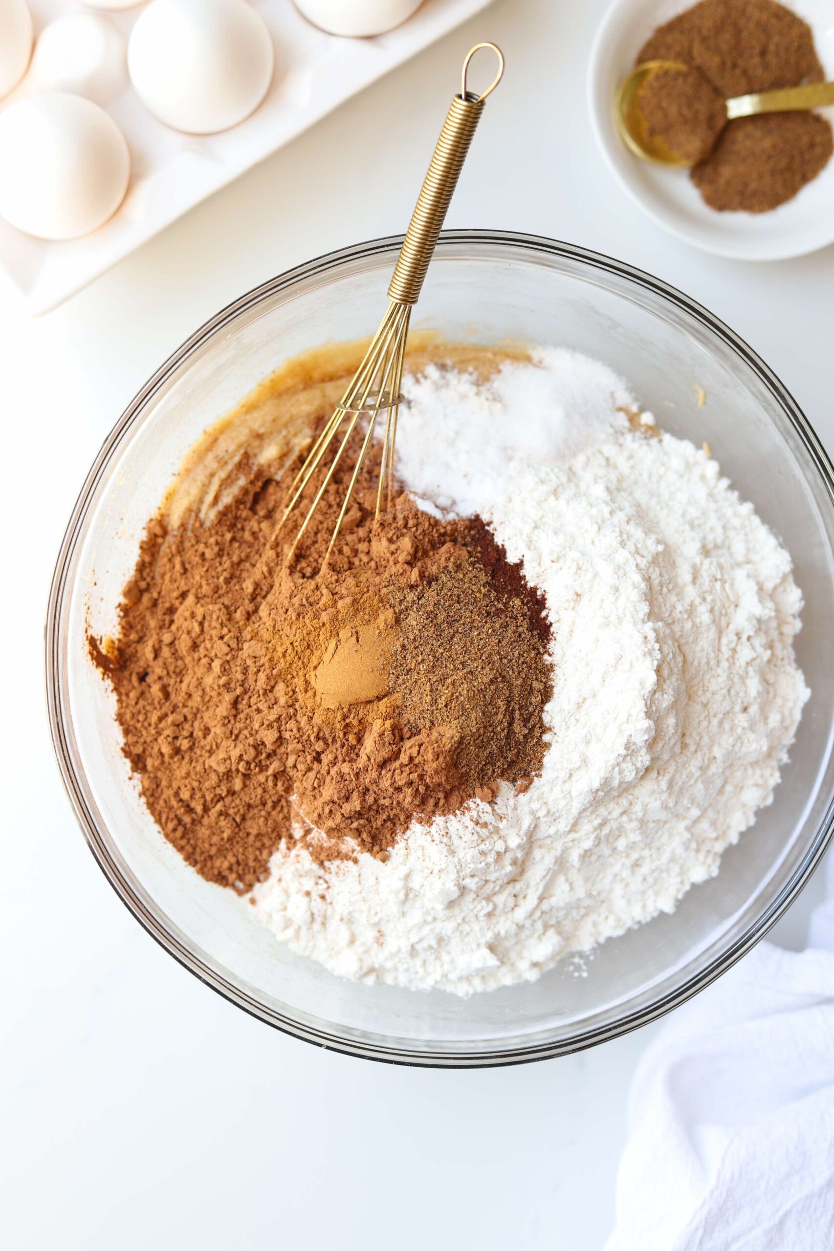 - Add 2 cups of all purpose flour, 1/2 cup of cocoa powder, 1 teaspoon of espresso powder, 1 teaspoon of baking soda, 3/4 teaspoon of salt, 1 1/2 teaspoons of garam masala and 1 teaspoon of ground cinnamon and mix until just combined