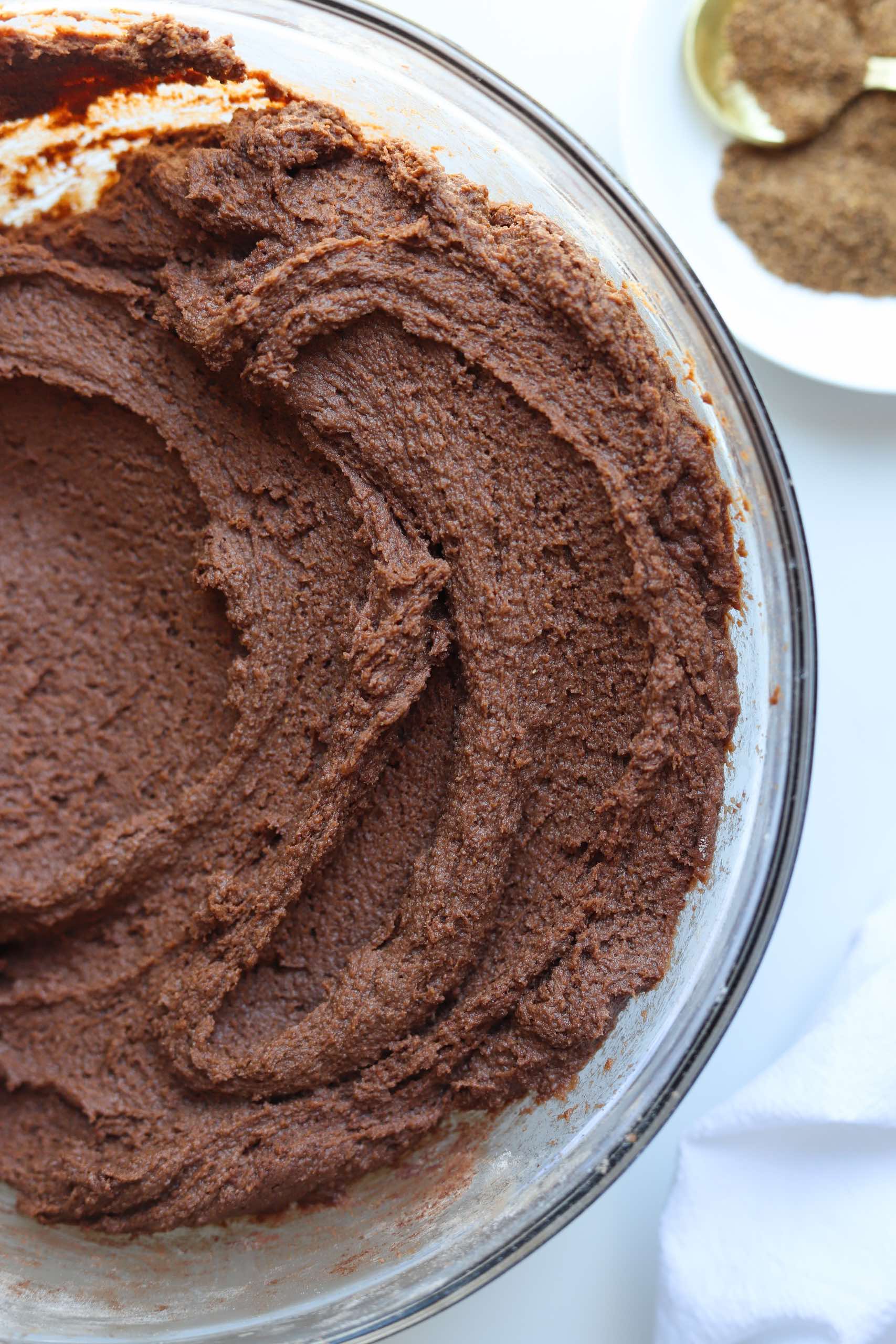 Add 2 cups of all purpose flour, 1/2 cup of cocoa powder, 1 teaspoon of espresso powder (optional, but highly recommended), 1 teaspoon of baking soda, 3/4 teaspoon of salt, 1 1/2 teaspoons of garam masala and 1 teaspoon of ground cinnamon. Mix until the cookie dough a just brought together and you no longer see dry ingredients unincorporated.