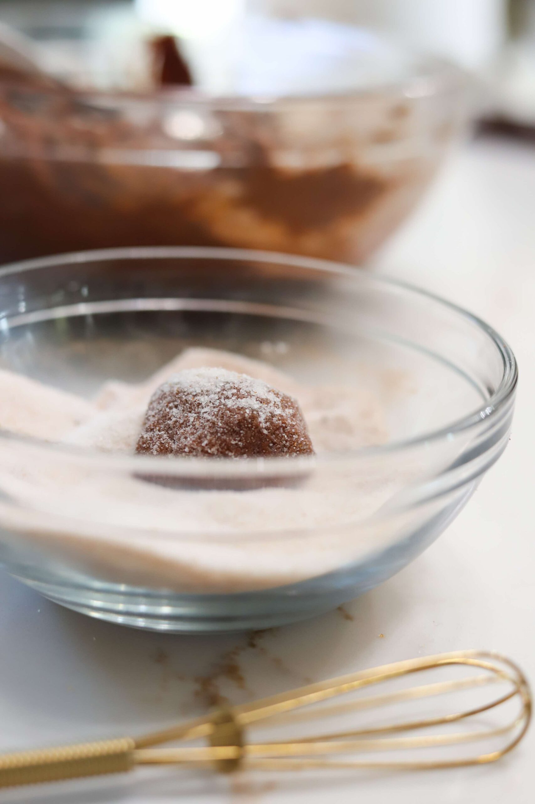 - Roll about 2 tablespoons of cookie dough into balls, roll generously in the cinnamon sugar and transfer onto a nonstick or parchment lined baking sheet leaving 2 inches between each