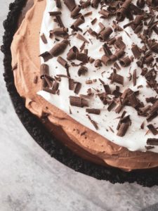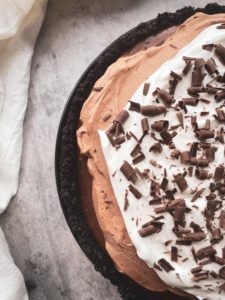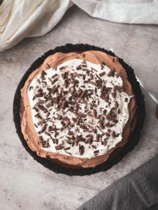 This beautiful chocolate mocha cream pie requires no baking and is chilled in an easy chocolate cookie crust. Every layer is full of deliciously chocolatey flavors with notes of coffee and fluffy whipped cream. It is perfect to make ahead for anything from a birthday party, holiday party or dinner party. Everyone will love this pie.