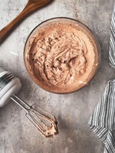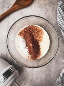 Next, make the mocha cream layer by combing 1 1/3 cups of heavy cream, 3 tablespoons of unsweetened natural cocoa powder, 1/4 cup of confectioners sugar and 2 tablespoons of cooled brewed coffee in a medium bowl. Use an electric hand mixer (or you could do this in a stand mixer) to whip the mixture until it is very light and fluffy.