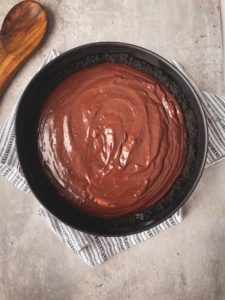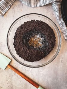 Begin by making the crust. In a medium bowl, combine 9 ounces of finely crushed chocolate cookies with 1/2 cup of melted butter. You can use oreos, Nabisco’s chocolate wafers or unfilled chocolate pizzelles.