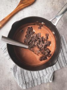 Once the mixture has thickened, transfer the saucepan onto a heat proof surface and whisk in 6 ounces of chopped semi-sweet chocolate, 2 teaspoons of vanilla extract and 2 tablespoons of butter until everything is smooth and fully combined.