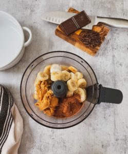 - Combine the frozen bananas with 1/2 cup of creamy peanut butter, 1/3 cup of the milk of your choice, 3 tablespoons of cocoa powder, 1 teaspoon of vanilla extract and a pinch of salt in a food processor or high speed blender