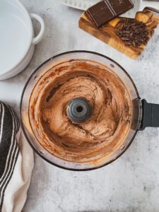 Once the bananas are frozen, place them into a food processor or high speed blender along with 1/2 cup of creamy peanut butter, 1/3 cup of milk (you can use anything from almond milk to heavy cream), 3 tablespoons of cocoa powder, 1 teaspoon of vanilla extract and a pinch of salt.