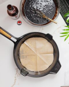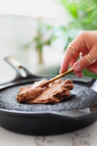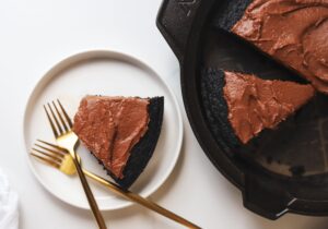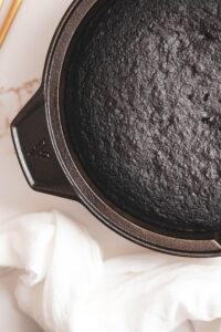This cake can be baked in any 8 cup volume baking dish, such as a 9″ round cake pan, an 8″x8″ square baking dish or a small cast iron skillet like this one.